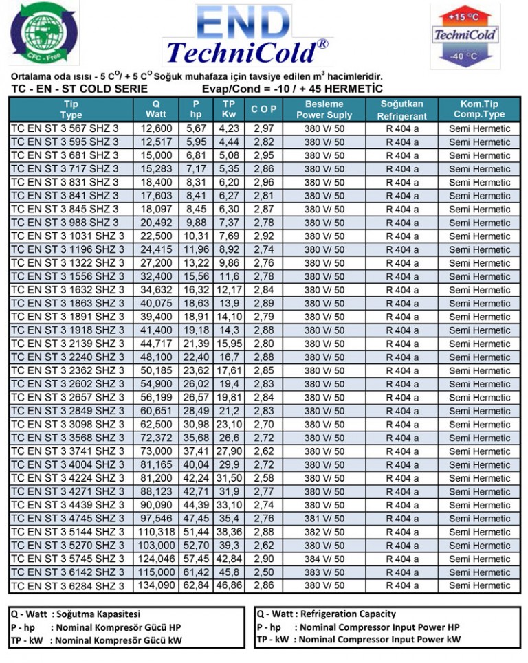 Serin, Soğuk ve Donmuş muhafaza odaları kullanım şartlarına uygun olarak 4.550 Watt ile 134.090 Watt soğutma kapasitesi aralıklarında 66 ayrı modelde ( Semi Hermetik) Yarı – Hermetik kompresörlü ve hava soğutmalı Kondanserli dış hava şartlarına uygun olarak kasetlenmiş. Avrupa Birliği normlarına uygun olup CE kalite belgeli olarak imal edilmektedir.